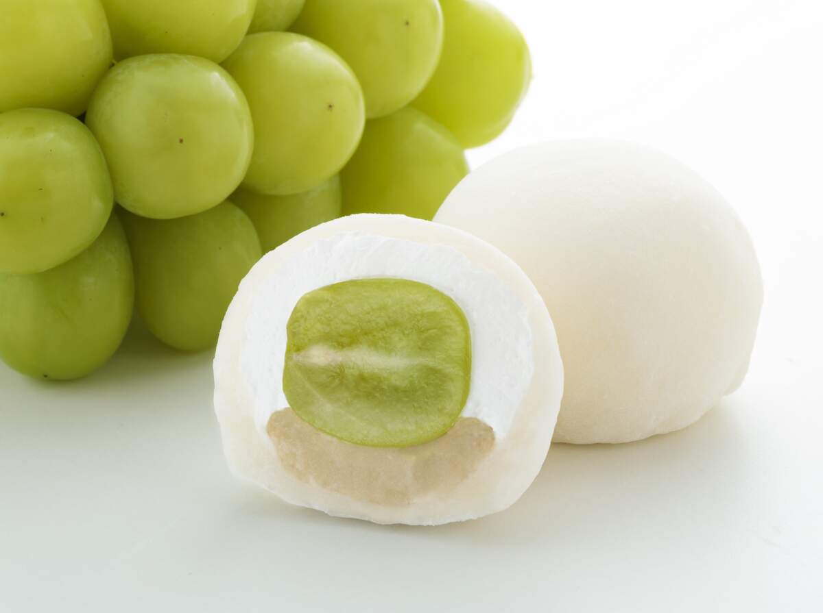 シャインマスカットをぶどう果汁で練り上げた餅生地で包みました。皮からはじけるジューシーでさわやかな果汁とぶどう餡の甘味が口の中いっぱいに広がります。