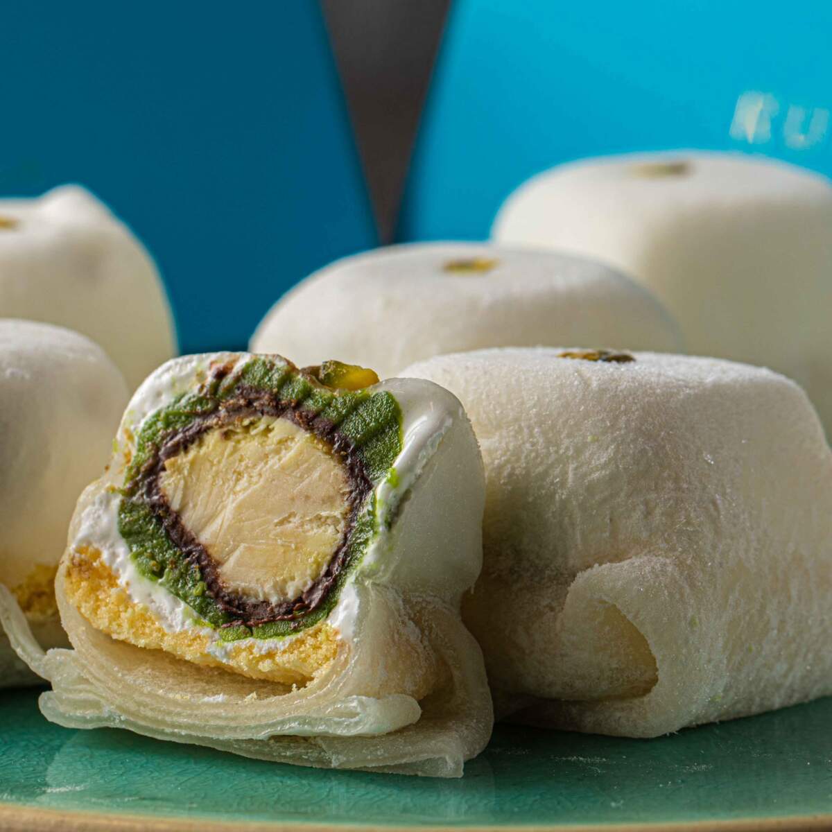 大きめのクリームチーズをチョコレートでコーティング。その周りをピスタチオペースト練り込んだ餡で覆い、もちもちのぎゅうひで包んであります。