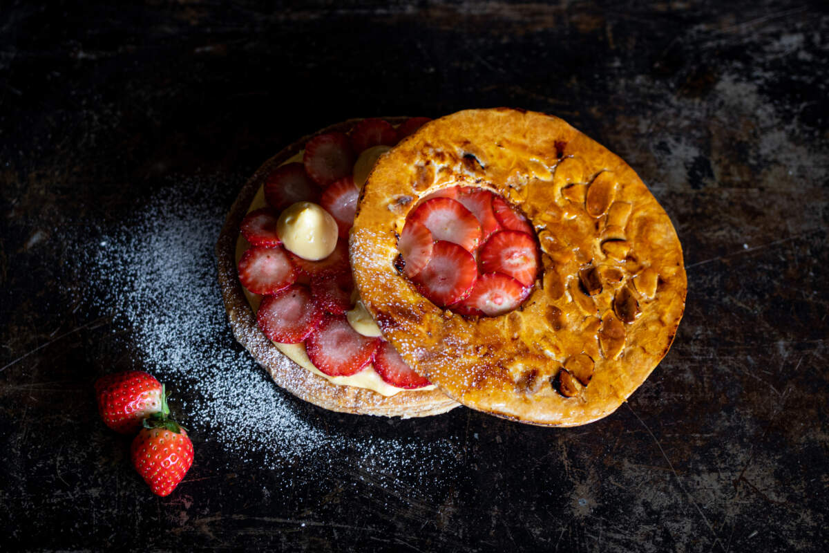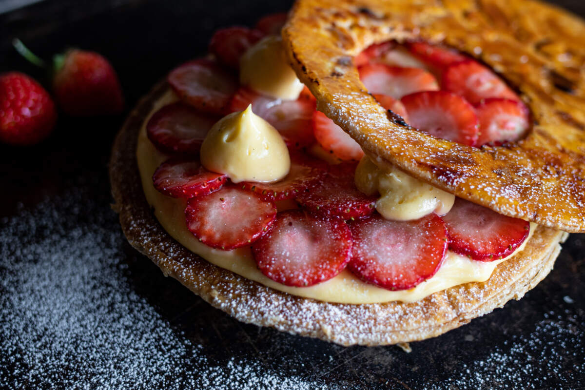 香ばしく焼き上げたアーモンドのパイに特製カスタードクリーム、そして国産いちごを使用したミルプレッセ。