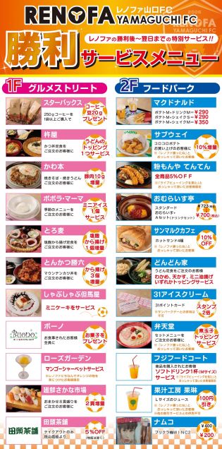 | 場所 | ※「レノファ勝利サービス」を実施している店舗 |