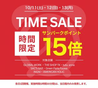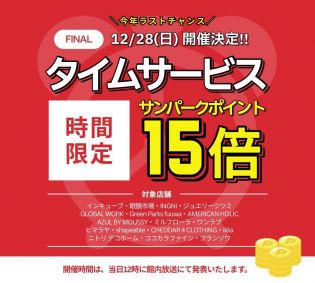 当日12時に発表される60分間の時間内に、対象店舗でお会計されるとサンパークポイントが15倍に‼(税抜200円につき15ポイント)