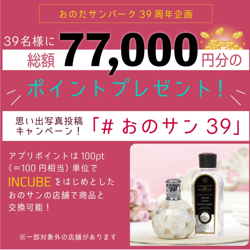 インスタグラム上でハッシュタグ「#おのサン39」を付けて、あなたのおのだサンパーク39年間の思い出写真を投稿してください。もちろん、現在のおのだサンパークの写真を投稿いただいてもOK!39周年にちなんで39名様におのだサンパークアプリポイント総額77,000ポイントをプレゼント!